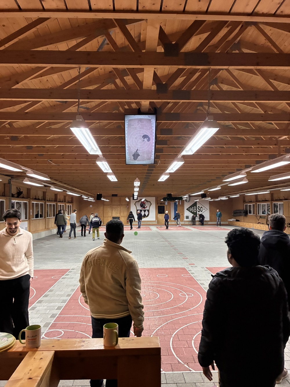 Stockschützenhalle mit Bildschirm an der Decke zum Ergebnis verfolgen